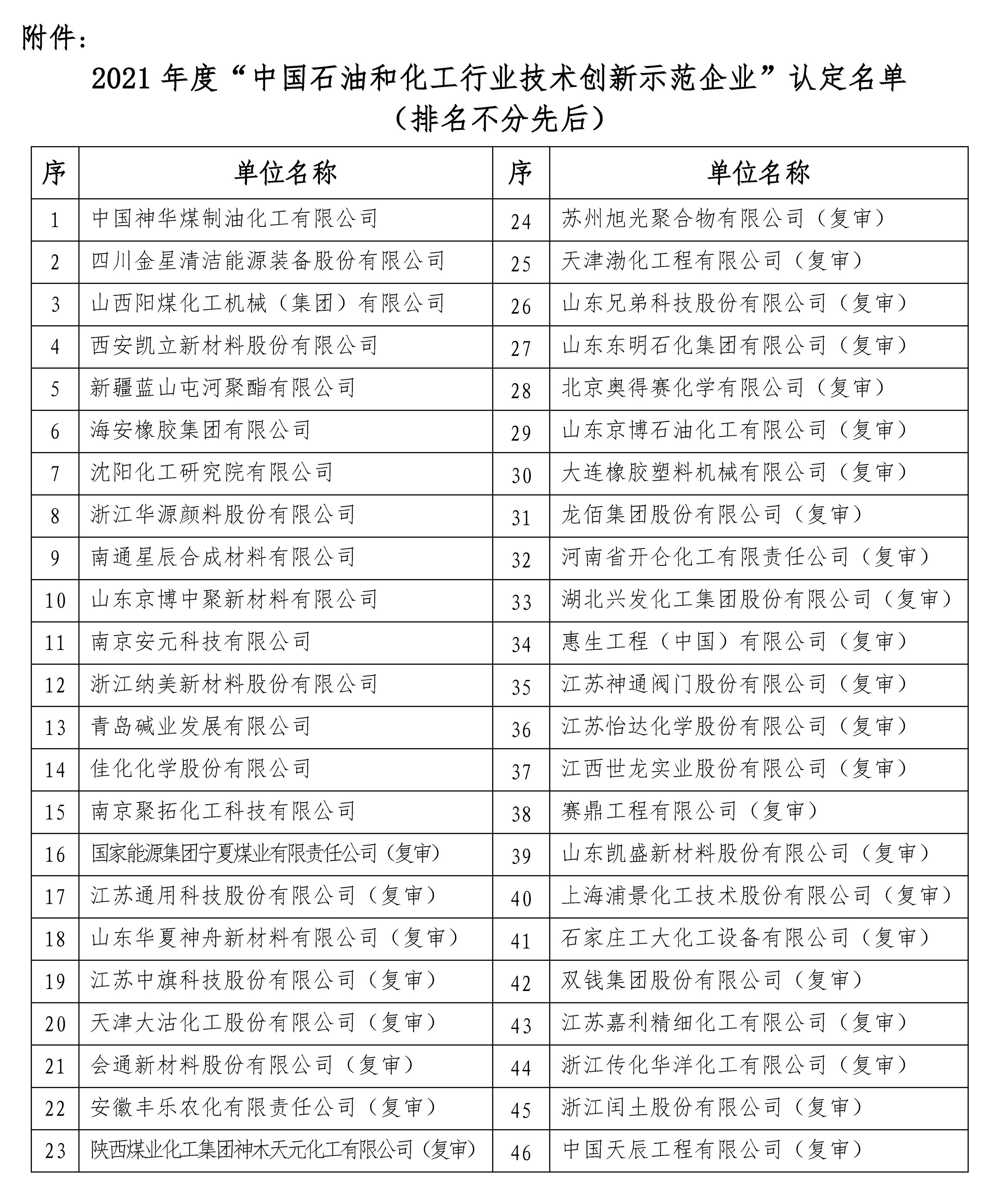 石油和化工行業(yè)技術(shù)創(chuàng)新示范企業(yè)是中國石油和化學(xué)工業(yè)聯(lián)合會從持續(xù)技術(shù)創(chuàng)新、核心技術(shù)攻關(guān)、科技成果轉(zhuǎn)化等方面,對石油化工企業(yè)進(jìn)行的全面系統(tǒng)評價,旨在鼓勵和引導(dǎo)企業(yè)加快構(gòu)建技術(shù)創(chuàng)新體系,加大技術(shù)創(chuàng)新投入,促進(jìn)科技成果落地,切實(shí)發(fā)揮技術(shù)創(chuàng)新示范作用。