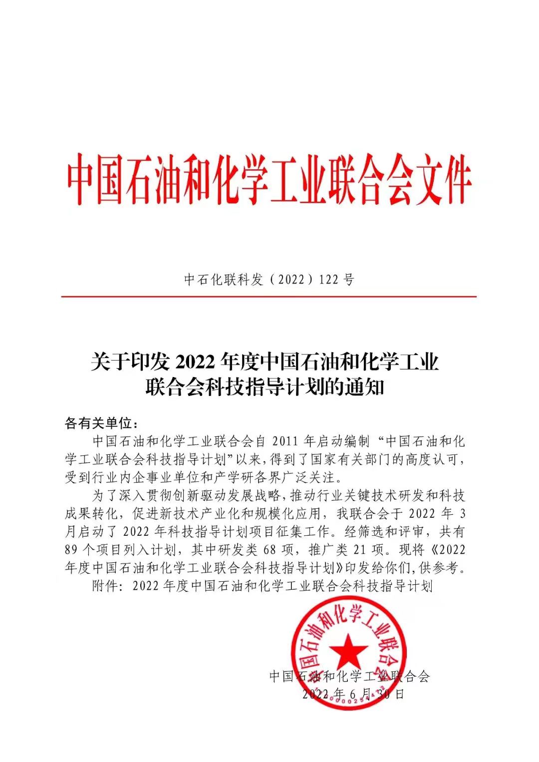 近日,中國石油和化學(xué)工業(yè)聯(lián)合會發(fā)布《關(guān)于印發(fā)2022年度中國石油和化學(xué)工業(yè)聯(lián)合會科技指導(dǎo)計劃的通知》(中石化聯(lián)科發(fā)〔2022〕122號),本次共有89個項目列入計劃,其中研發(fā)類68項,推廣類21項。我公司“種子乳液法糊樹脂工程設(shè)計技術(shù)”通過篩選和評審,被列入推廣類技術(shù)。