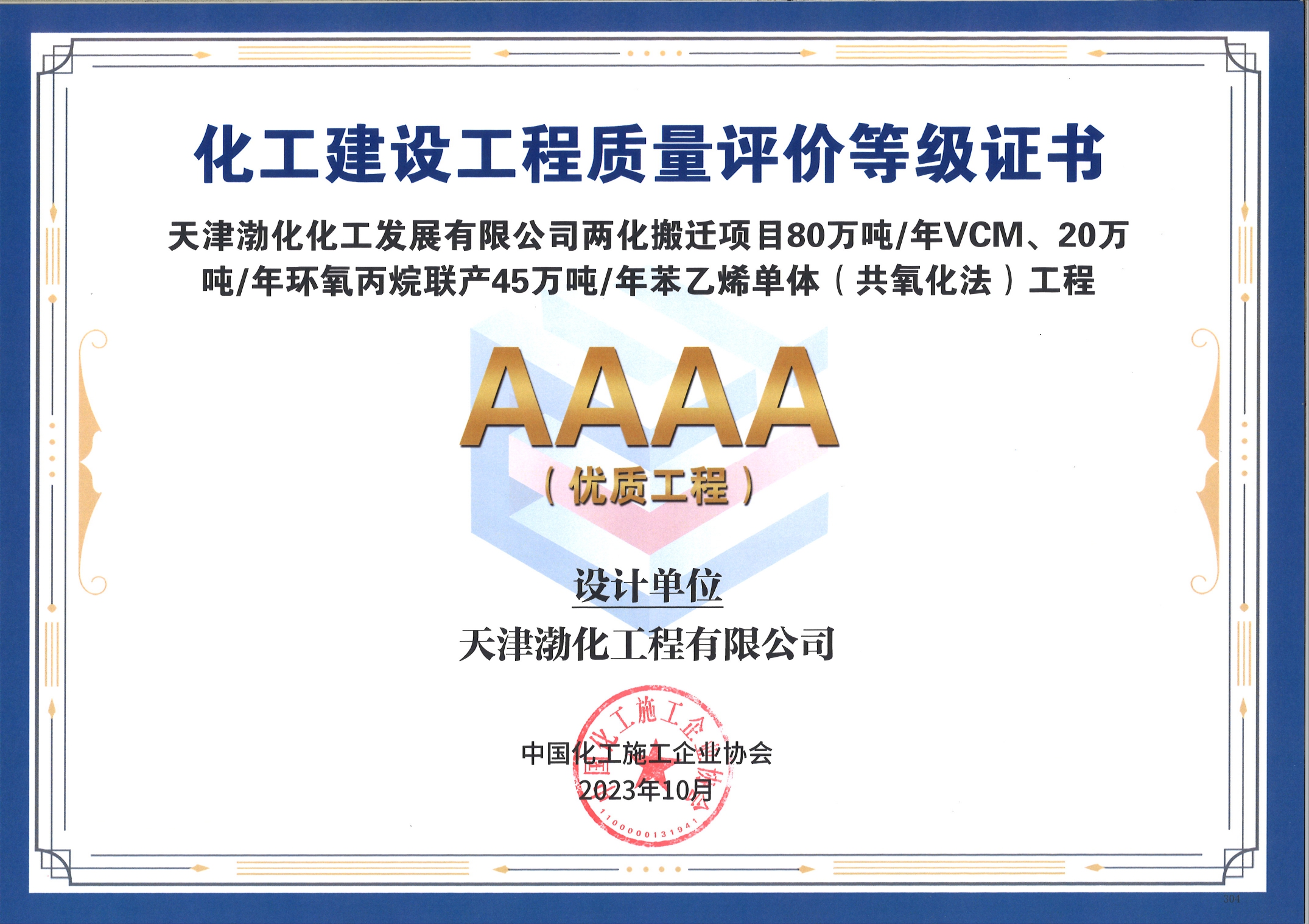 10月,公司設(shè)計(jì)的天津渤化化工發(fā)展有限公司兩化搬遷項(xiàng)目80萬噸/年VCM工程,獲中國化工施工企業(yè)協(xié)會化工建設(shè)工程質(zhì)量評價(jià)AAAA級證書。