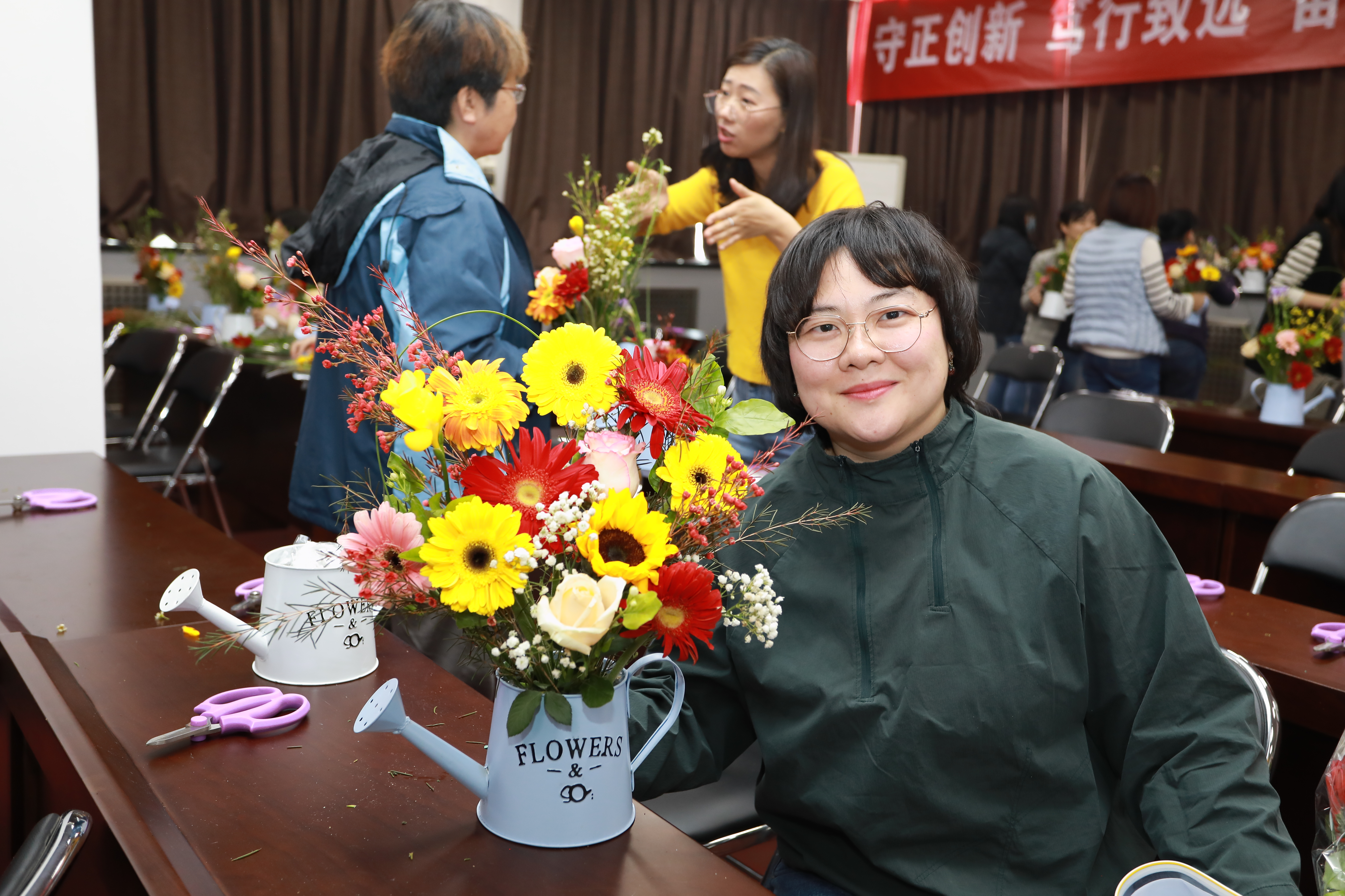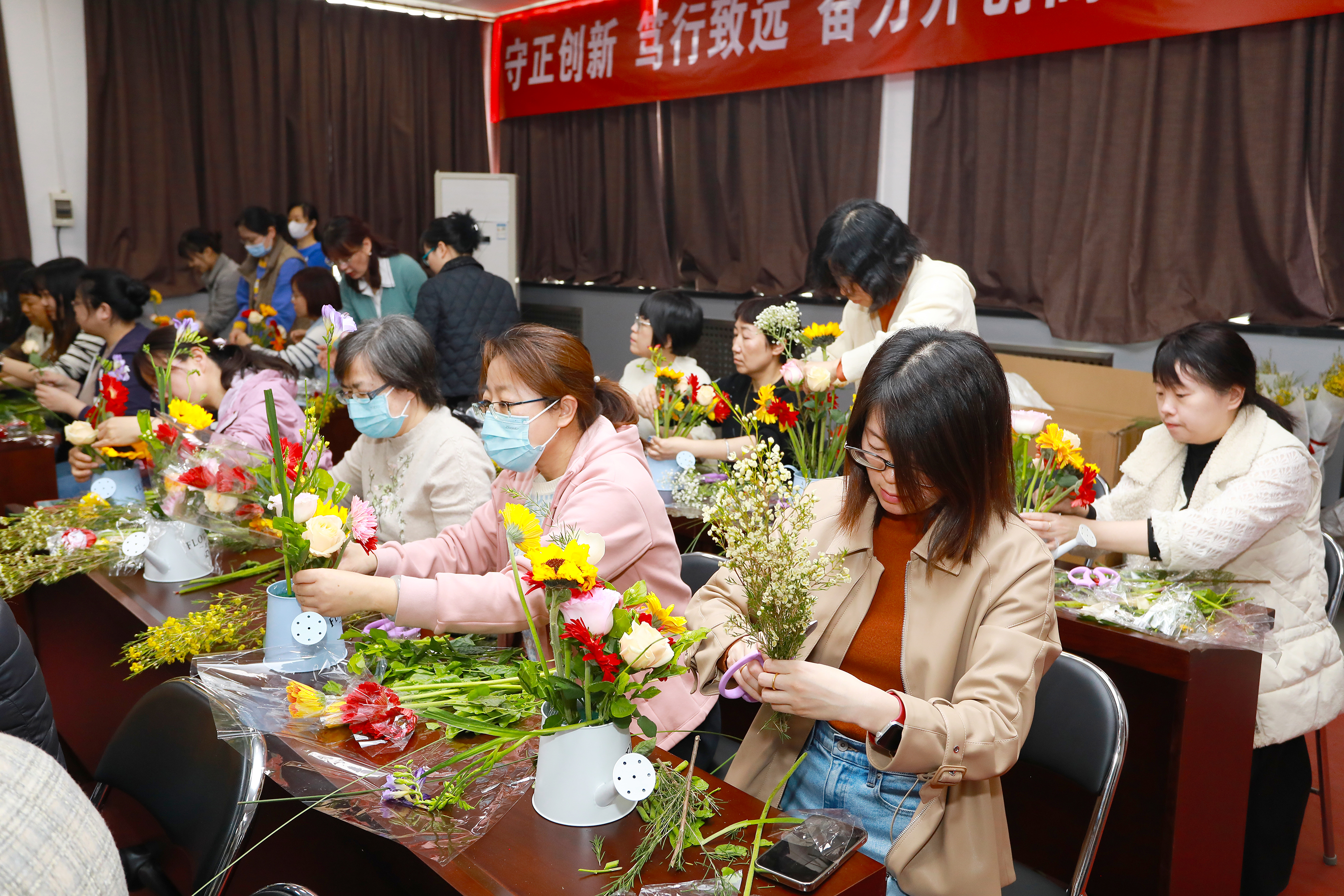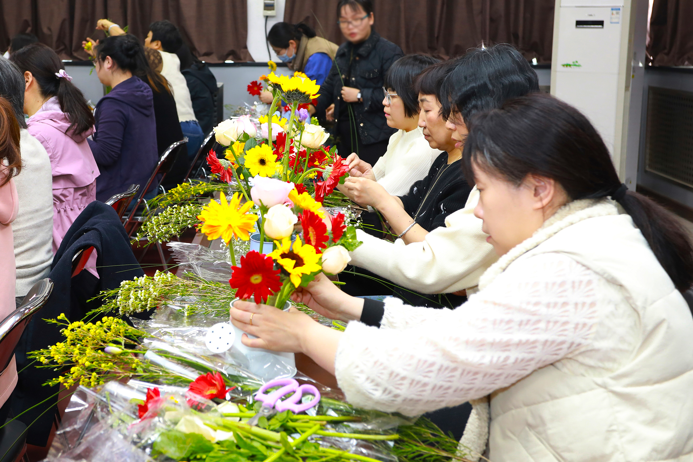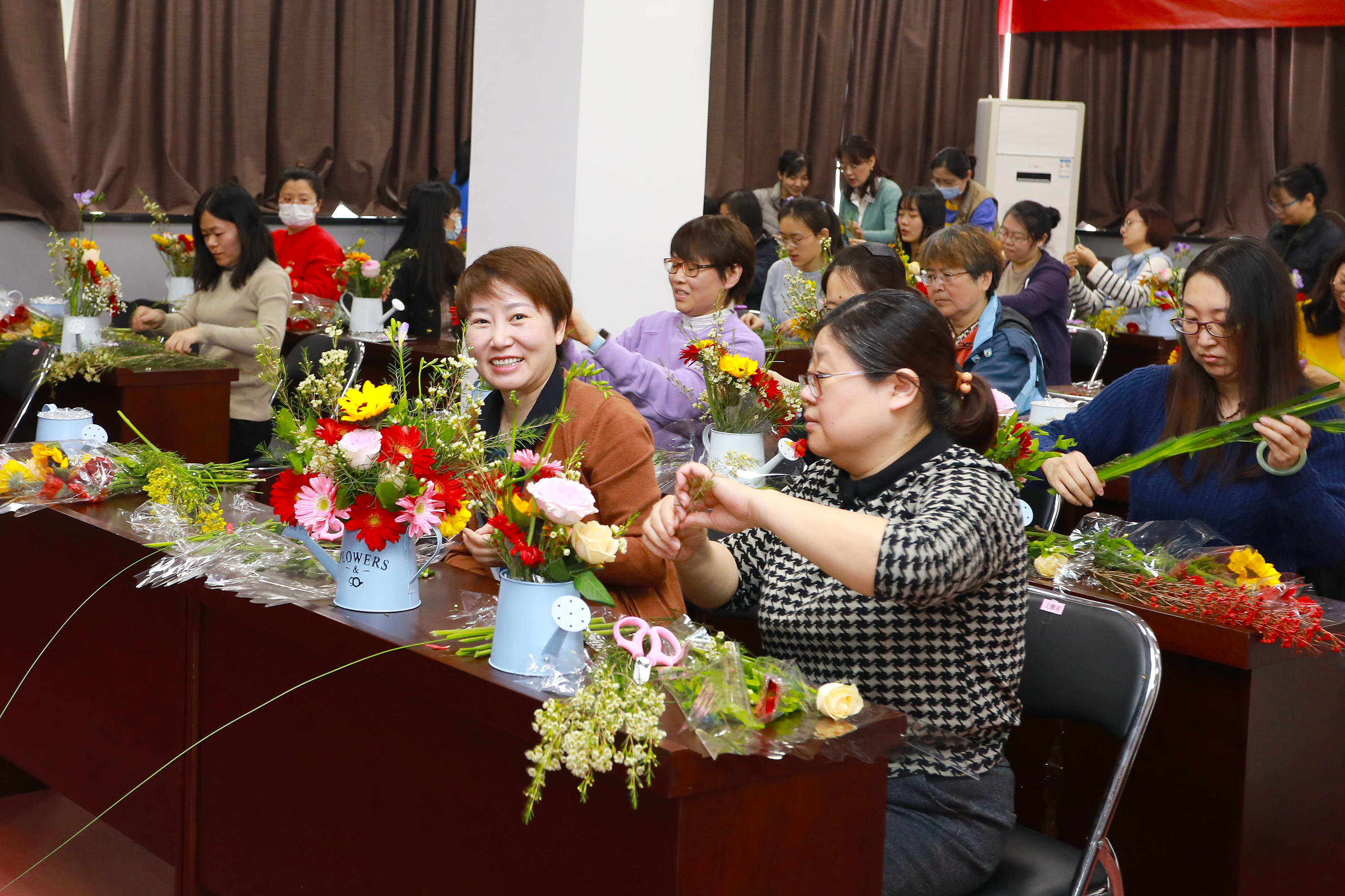 本次活動(dòng)邀請(qǐng)了擁有多年插花經(jīng)驗(yàn)的花藝?yán)蠋?,從鮮花的品種、寓意和養(yǎng)護(hù),到花卉的選擇、顏色的搭配、花枝的修剪等插花技巧進(jìn)行了詳細(xì)講授,并現(xiàn)場(chǎng)示范指導(dǎo)大家進(jìn)行DIY插花。一支支清新淡雅的康乃馨,濃烈絢爛的紅玫瑰,金色活潑的向日葵…….經(jīng)過(guò)大家的巧手修枝剪葉及巧妙的創(chuàng)意組合,勾勒出一盆盆賞心悅目的插花作品?;顒?dòng)現(xiàn)場(chǎng)花香四溢,充滿了歡聲笑語(yǔ)。