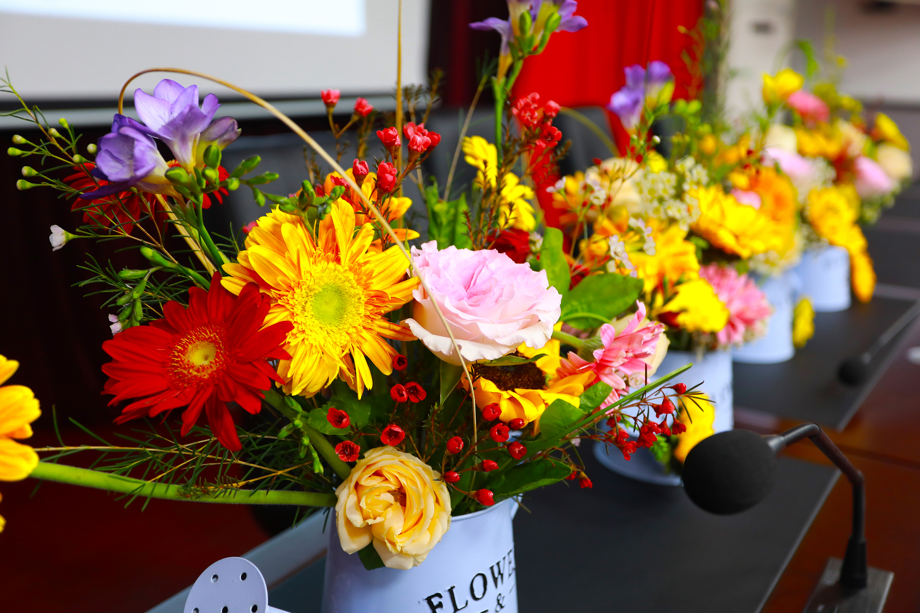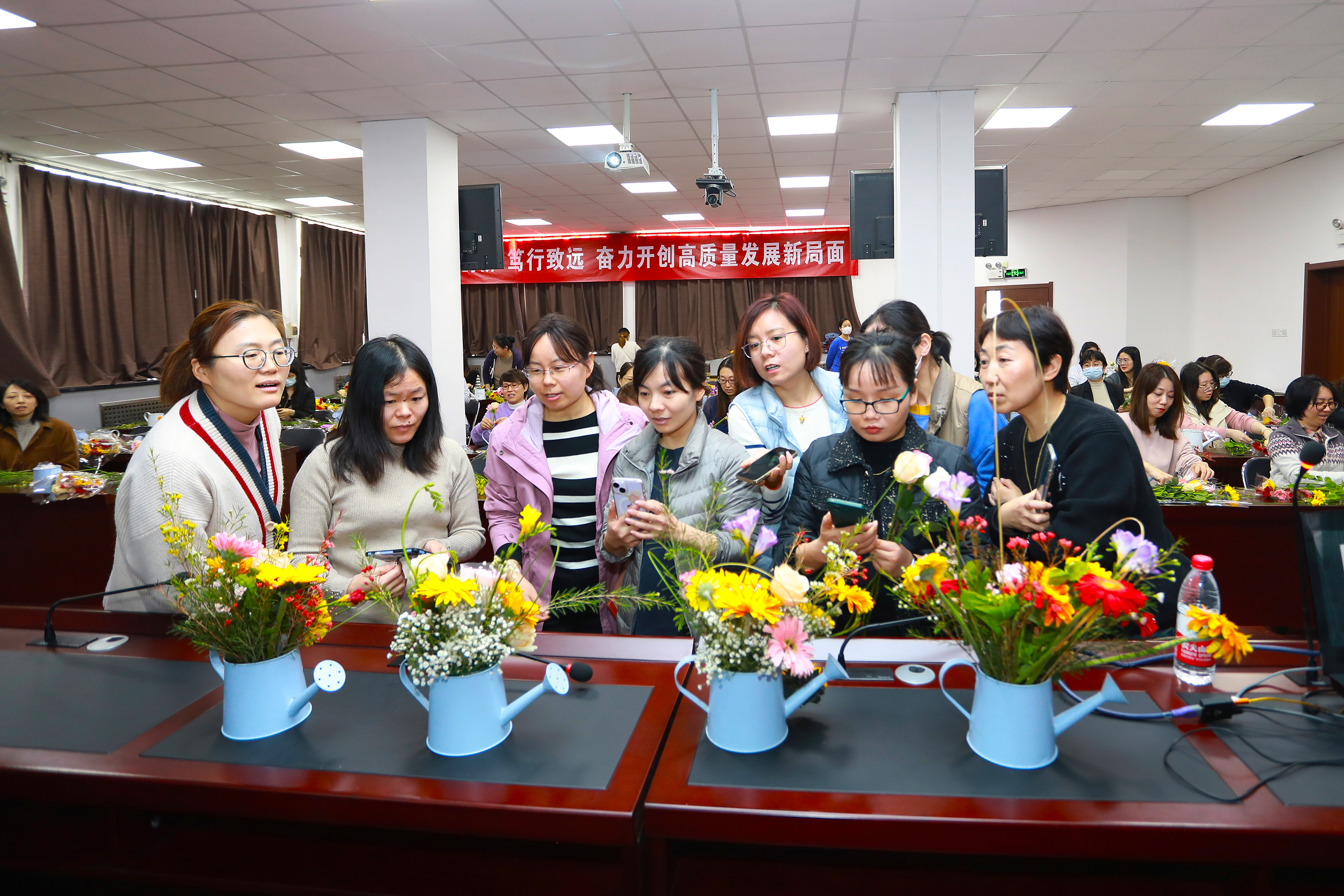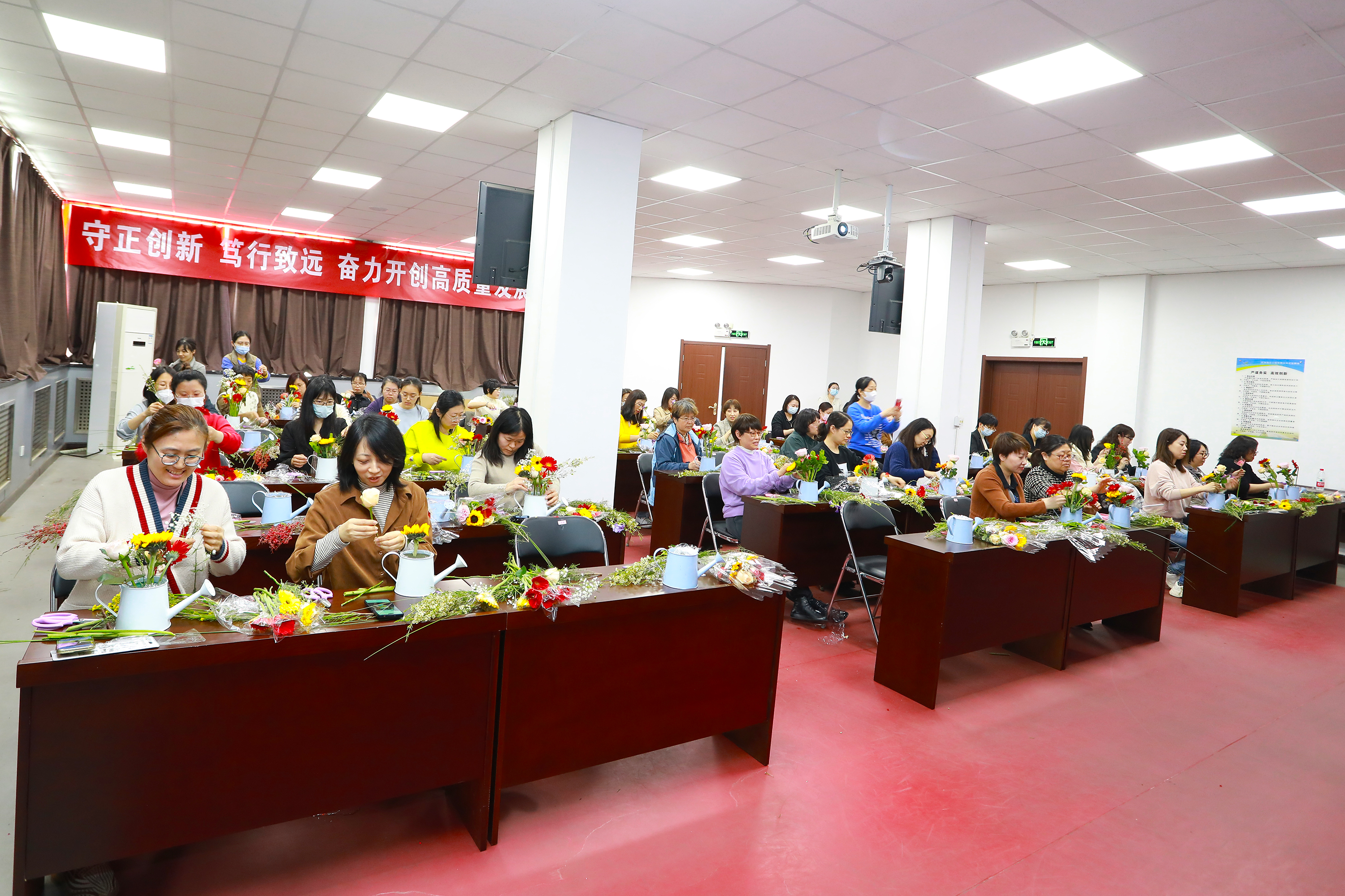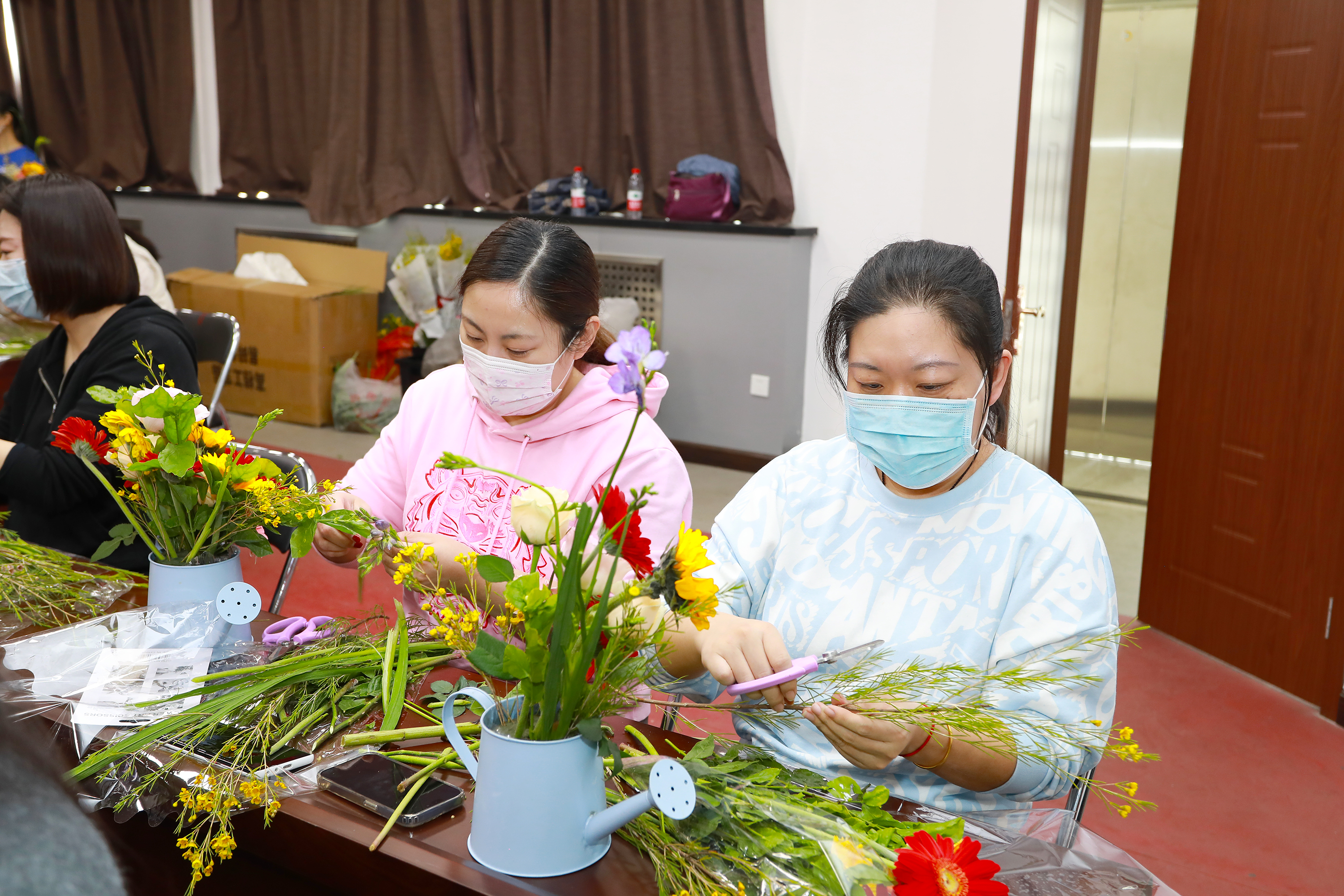 本次活動(dòng)邀請(qǐng)了擁有多年插花經(jīng)驗(yàn)的花藝?yán)蠋?,從鮮花的品種、寓意和養(yǎng)護(hù),到花卉的選擇、顏色的搭配、花枝的修剪等插花技巧進(jìn)行了詳細(xì)講授,并現(xiàn)場(chǎng)示范指導(dǎo)大家進(jìn)行DIY插花。一支支清新淡雅的康乃馨,濃烈絢爛的紅玫瑰,金色活潑的向日葵…….經(jīng)過(guò)大家的巧手修枝剪葉及巧妙的創(chuàng)意組合,勾勒出一盆盆賞心悅目的插花作品?;顒?dòng)現(xiàn)場(chǎng)花香四溢,充滿了歡聲笑語(yǔ)。