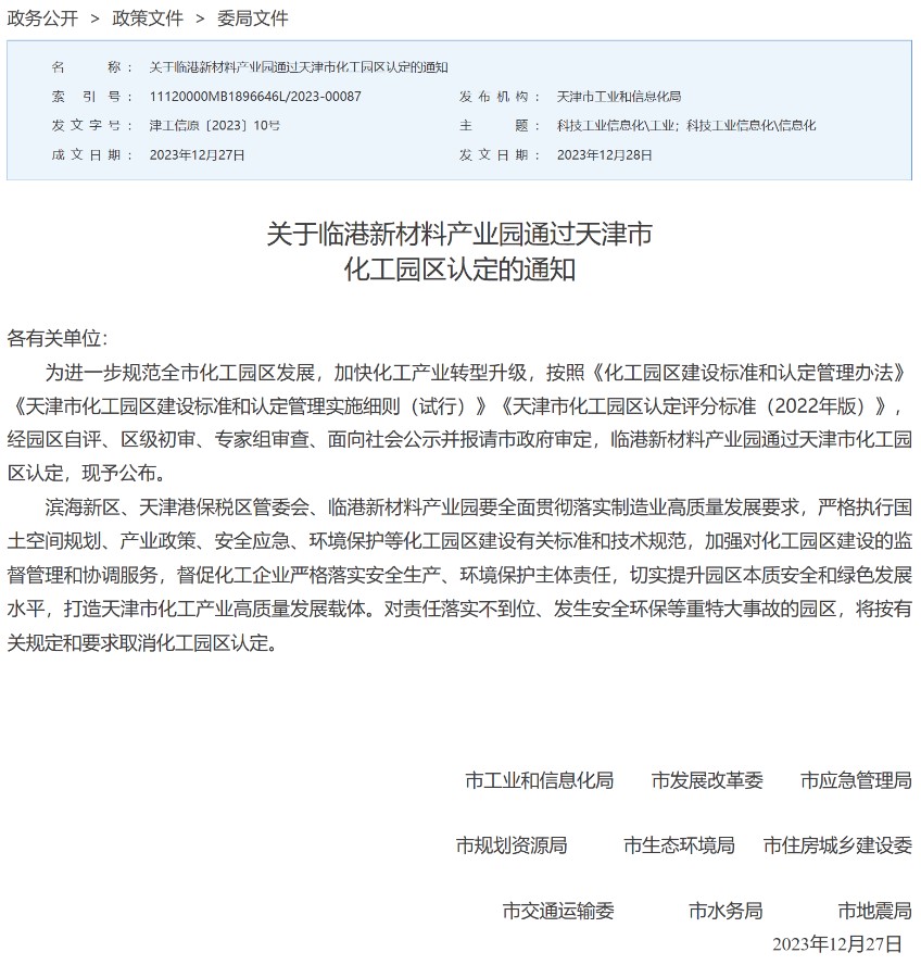 2023 年 2 月 14 日,渤化工程編制的《臨港新材料產(chǎn)業(yè)園總體規(guī)劃(2022-2035 年)》《臨港新材料產(chǎn)業(yè)園產(chǎn)業(yè)規(guī)劃(2022-2035 年)》通過專家評審會。3 月 13 日,濱海新區(qū)工業(yè)和信息化局組織各相關部門在空港投資發(fā)展中心開展臨港新材料產(chǎn)業(yè)園區(qū)級初審工作。4 月 28 日,天津港保稅區(qū)城環(huán)局組織《臨港新材料產(chǎn)業(yè)園總體規(guī)劃(2022-2035 年)環(huán)境影響評價》公眾參與座談會。5 月 22 日,天津市工業(yè)和信息化局組織各相關部門在天津港保稅區(qū)臨港環(huán)境監(jiān)測和應急管理中心開展臨港新材料產(chǎn)業(yè)園園區(qū)認定相關工作。6 月 27 日至 7 月 3 日,天津市工信局擬認定“臨港新材料產(chǎn)業(yè)園”為化工園區(qū),面向社會公示。12 月 28 日,經(jīng)園區(qū)自評、區(qū)級初審、專家組審查、面向社會公示并報請市政府審定,臨港新材料產(chǎn)業(yè)園通過天津市化工園區(qū)認定。