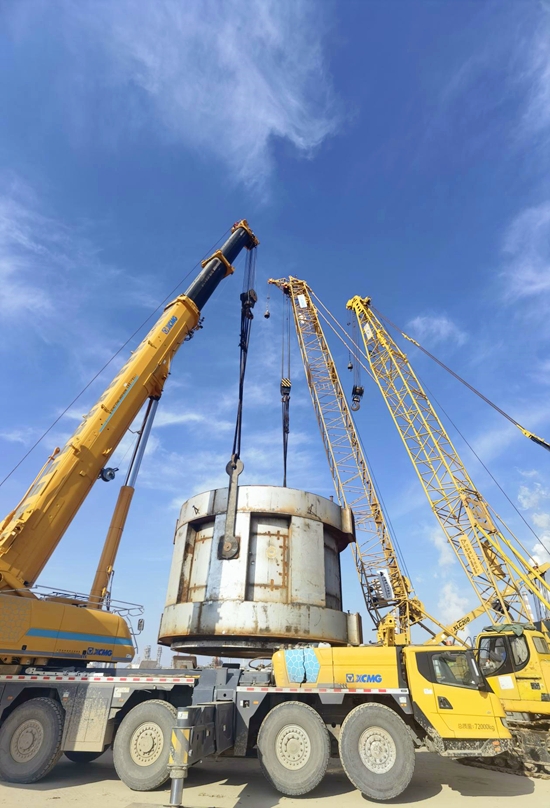 反應(yīng)器翻轉(zhuǎn)吊裝作業(yè)重量達(dá)220噸,翻轉(zhuǎn)作業(yè)前,項(xiàng)目組根據(jù)有關(guān)規(guī)范、行業(yè)標(biāo)準(zhǔn)、業(yè)主要求、設(shè)備結(jié)構(gòu)和現(xiàn)場(chǎng)條件制訂了詳細(xì)的吊裝方案。項(xiàng)目組根據(jù)方案內(nèi)容進(jìn)行了場(chǎng)地、索具、起重機(jī)、人員的相關(guān)檢查和交底培訓(xùn)。當(dāng)天現(xiàn)場(chǎng)準(zhǔn)備工作就緒后,試吊觀察無(wú)異常,正式起吊作業(yè)開(kāi)始。吊裝作業(yè)經(jīng)過(guò)設(shè)備移位、撤墩、鞍座擺放、溜尾提升、主吊旋轉(zhuǎn)等一系列動(dòng)作,反應(yīng)器平穩(wěn)翻轉(zhuǎn)就位。翻轉(zhuǎn)后,反應(yīng)器的殼體制造節(jié)點(diǎn)已全部完成,進(jìn)入到設(shè)備總裝階段。
