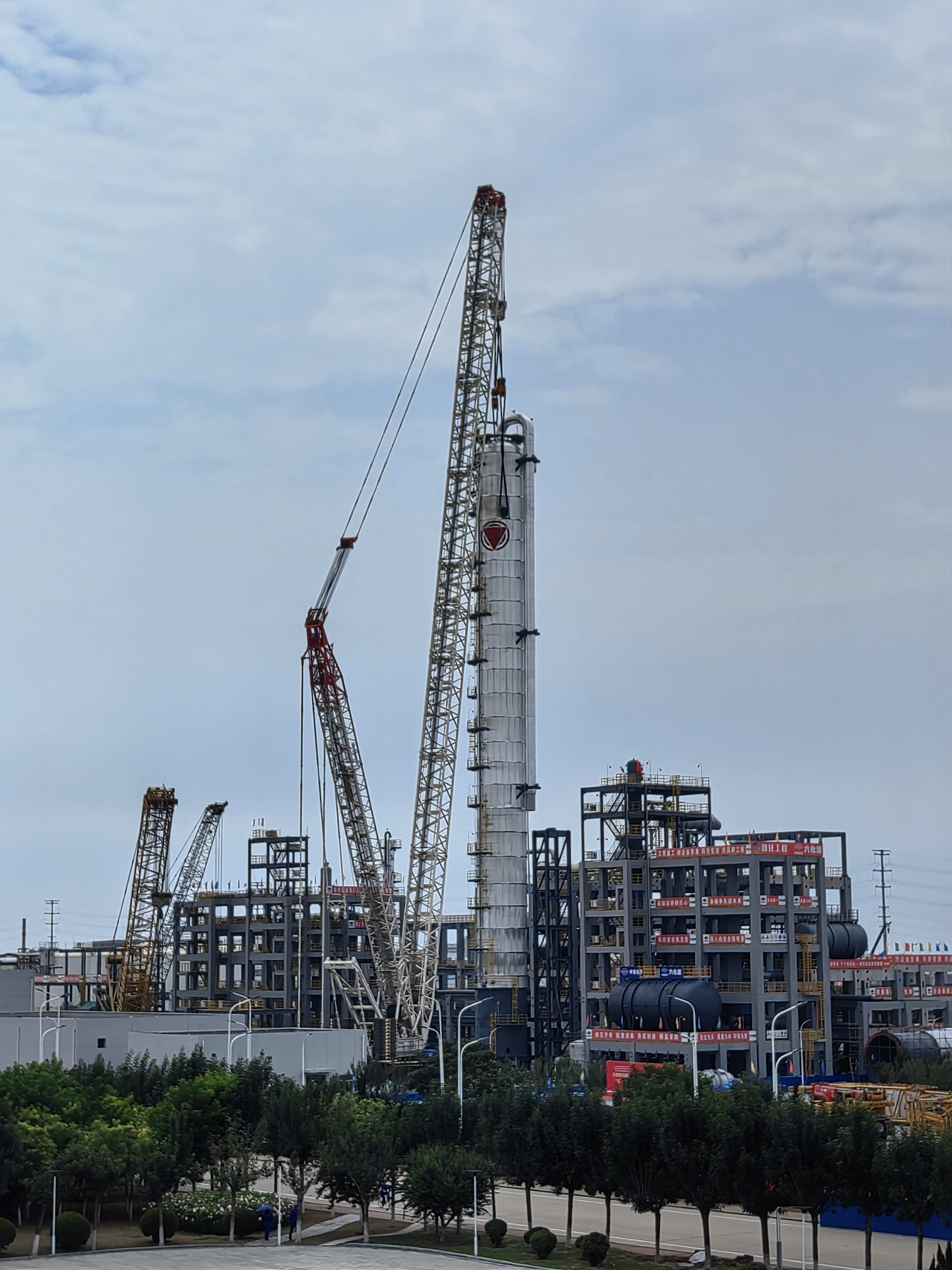 9時18分開始,本項目最大單體設(shè)備、總起吊重量達(dá)500余噸的丁醛異構(gòu)物塔在1600噸級履帶吊車牽引下緩緩升起,經(jīng)過數(shù)小時緊張作業(yè),精準(zhǔn)就位,標(biāo)志著項目建設(shè)邁入新階段,為項目后續(xù)設(shè)備安裝、系統(tǒng)調(diào)試及投產(chǎn)運行奠定了堅實基礎(chǔ)。
