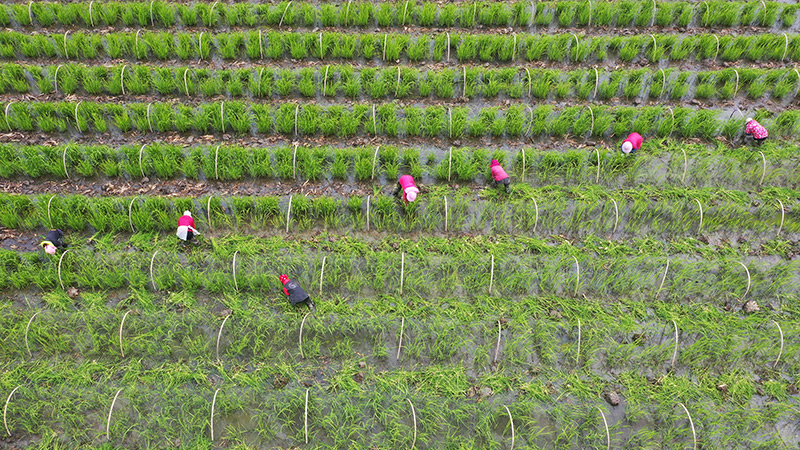 2023年2月23日,浙江省溫嶺市新河鎮(zhèn)農(nóng)民進行茭白秧苗春季管理(無人機照片)。新華社發(fā)(周學(xué)軍 攝)